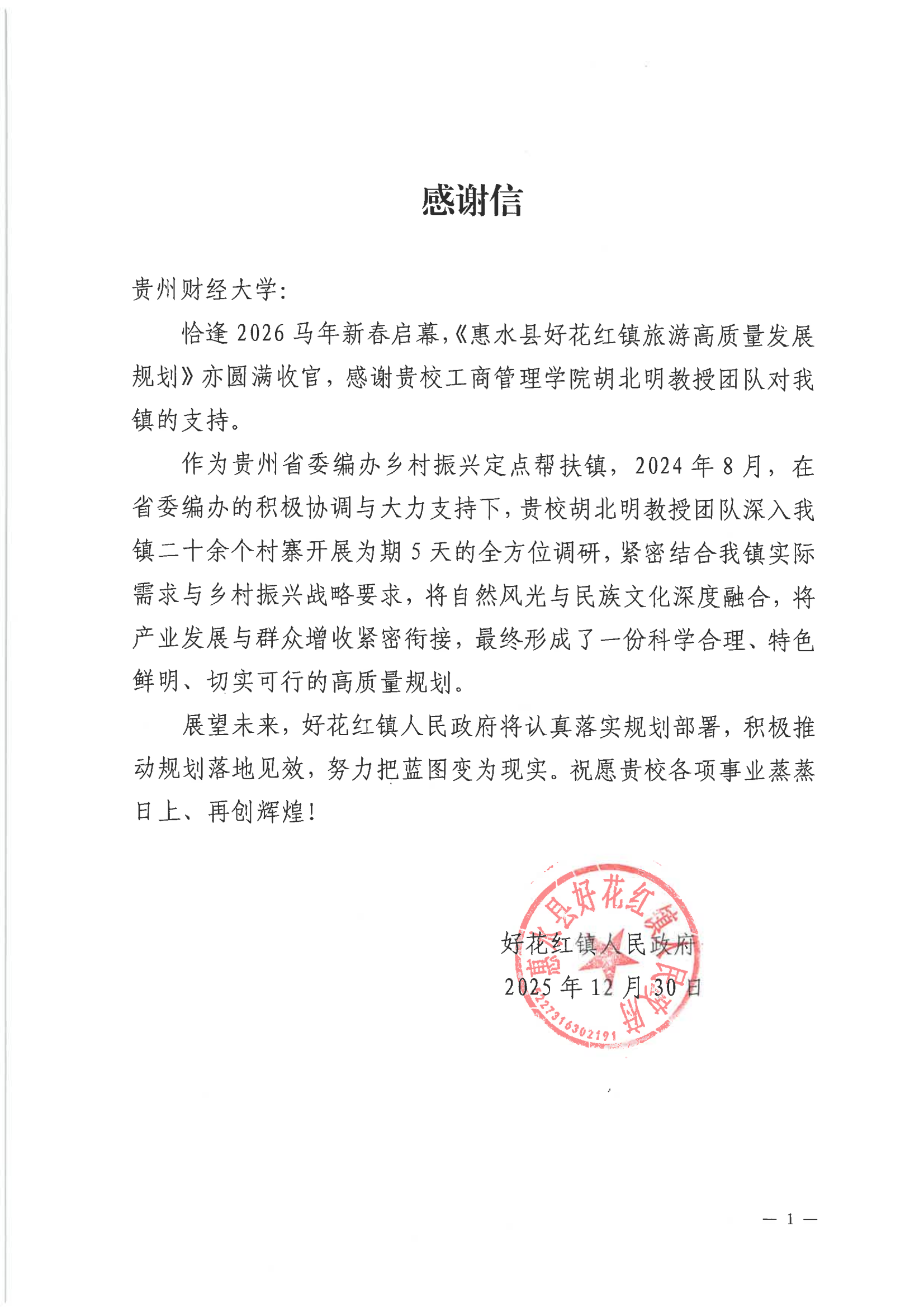 近日,我校收到惠水县好花红镇人民政府发来的感谢信,对工商管理学院胡北明教授团队圆满完成《惠水县好花红镇旅游高质量发展规划》编制工作给予高度认可,对我校助力乡村振兴的责任担当深表谢意。