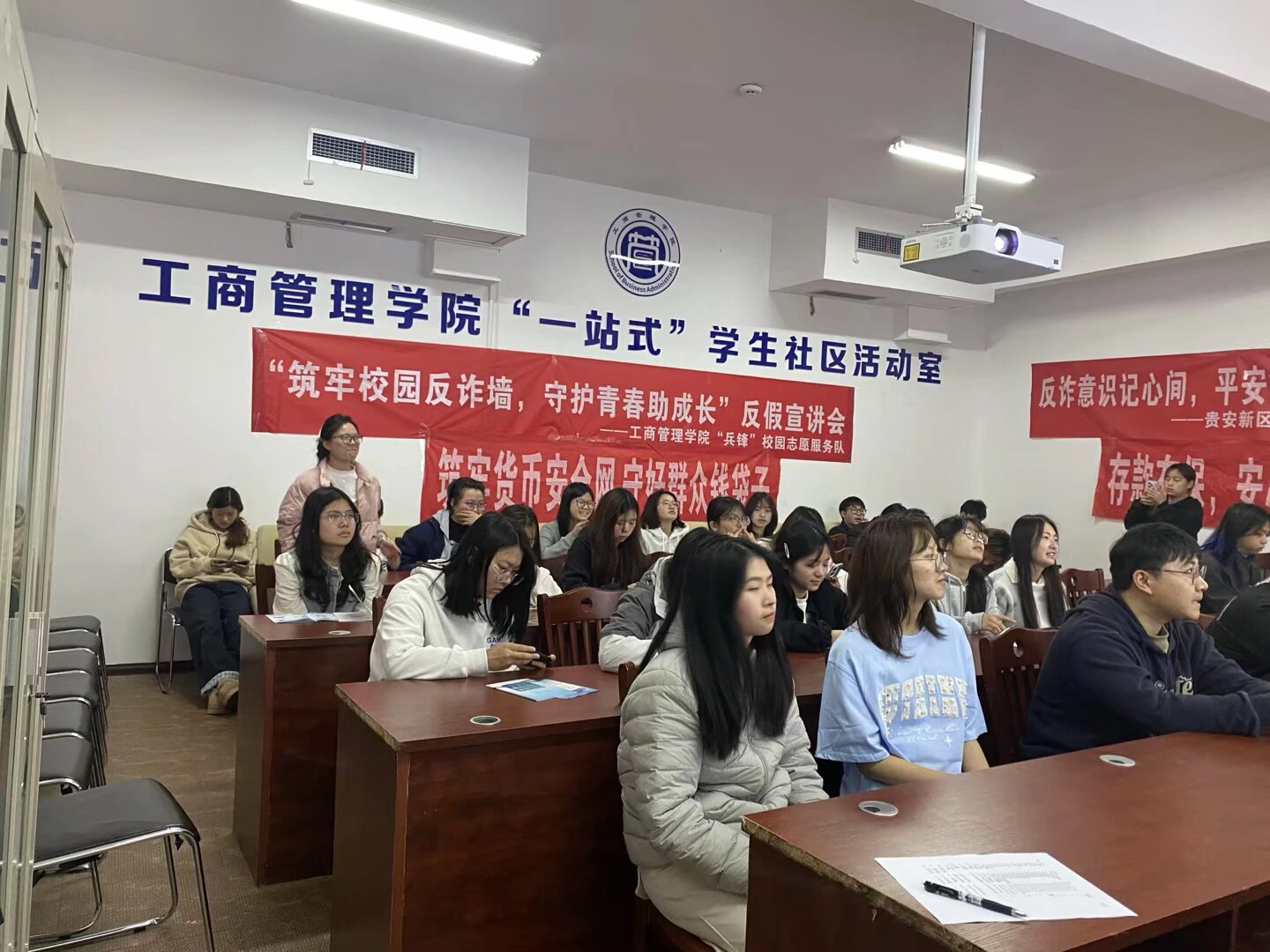 为切实增强大学生反诈防骗意识,提升识骗、防骗、拒骗能力,守护校园财产安全与和谐稳定,工商管理学院“兵锋”校园志愿服务队联合贵安新区发展村镇银行股份有限公司,于2026年3月17日在学生社区翠竹苑三栋活动室开展“筑牢校园反诈墙,守护青春助成长”反诈主题宣讲会。